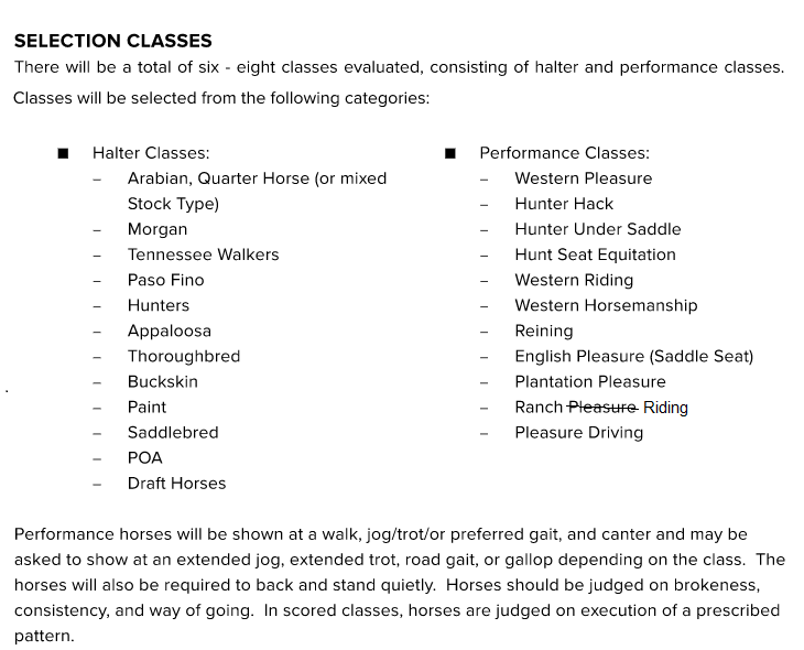 The Florida State Fair will host a 4-H Horse Judging Contest on Saturday, February 7, 2026 at the Equestrian Center Covered Arena. Check in will begin at 12:30 p.m., the contest begins at 1:30 p.m., and awards will be announced in the arena at roughly 5:30 p.m. The list of potential classes is listed below. The contest will consist of up to eight classes to place - four halter and four performance. Participants will be asked one set of questions on a class which will be selected at the contest.
